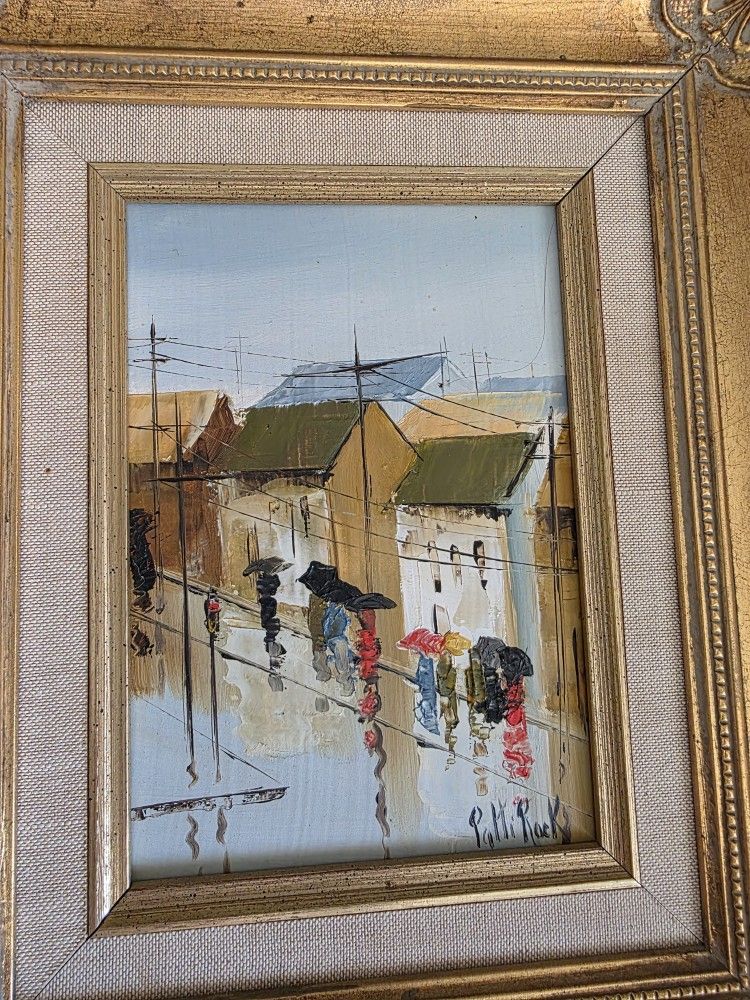 This vintage oil painting landscape by Patti Rock depicts a realistic scene with vibrant colors and expert technique. Measuring 8x11inches, this framed painting is a single piece original work signed by the artist. Created in California, USA during the Post-War period from 1940 to 1970, it showcases the beauty of nature in a traditional Realism style. The handmade canvas painting exudes a timeless charm that makes it a valuable addition to any art collection.