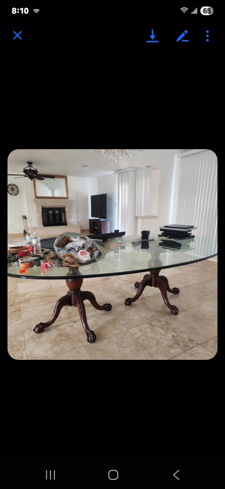 Large Dining room table Glass table seats 10 people comfortably Glass is about half inch thick as you can see by the knuckle on my finger no chips no scratches Glass alone is more then I am asking see all pictures very sturdy base. I can NOT help load this due to shoulder surgery. This is located in Mesa close to Baseline and 101 can Not ship cash n carry only BRING HELP table is 5 feet wide by 8 feet long Does not come with chairs