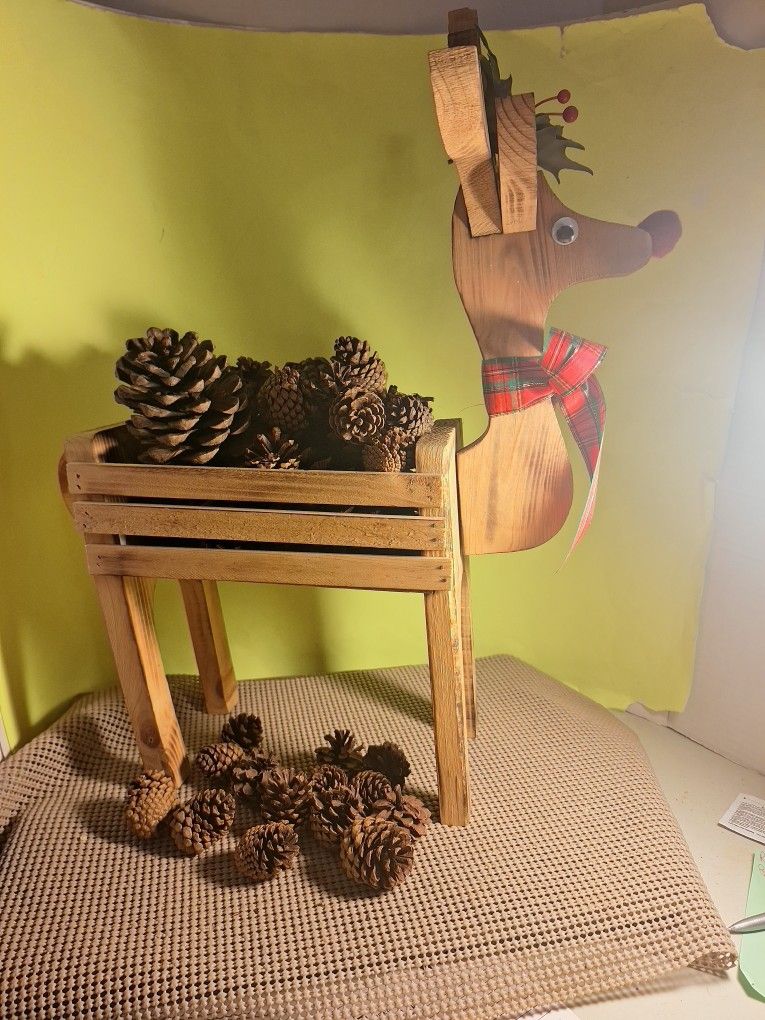 Vintage Hand Made Wood Reindeer Crate Box With Pinecones-$35.00