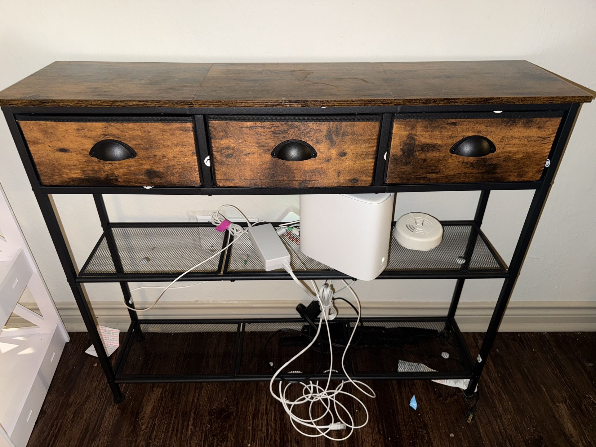Entry way table with three drawers. Gently used. Originally bought form Amazon. Used to hold WiFi router and storage. Great for small spaces