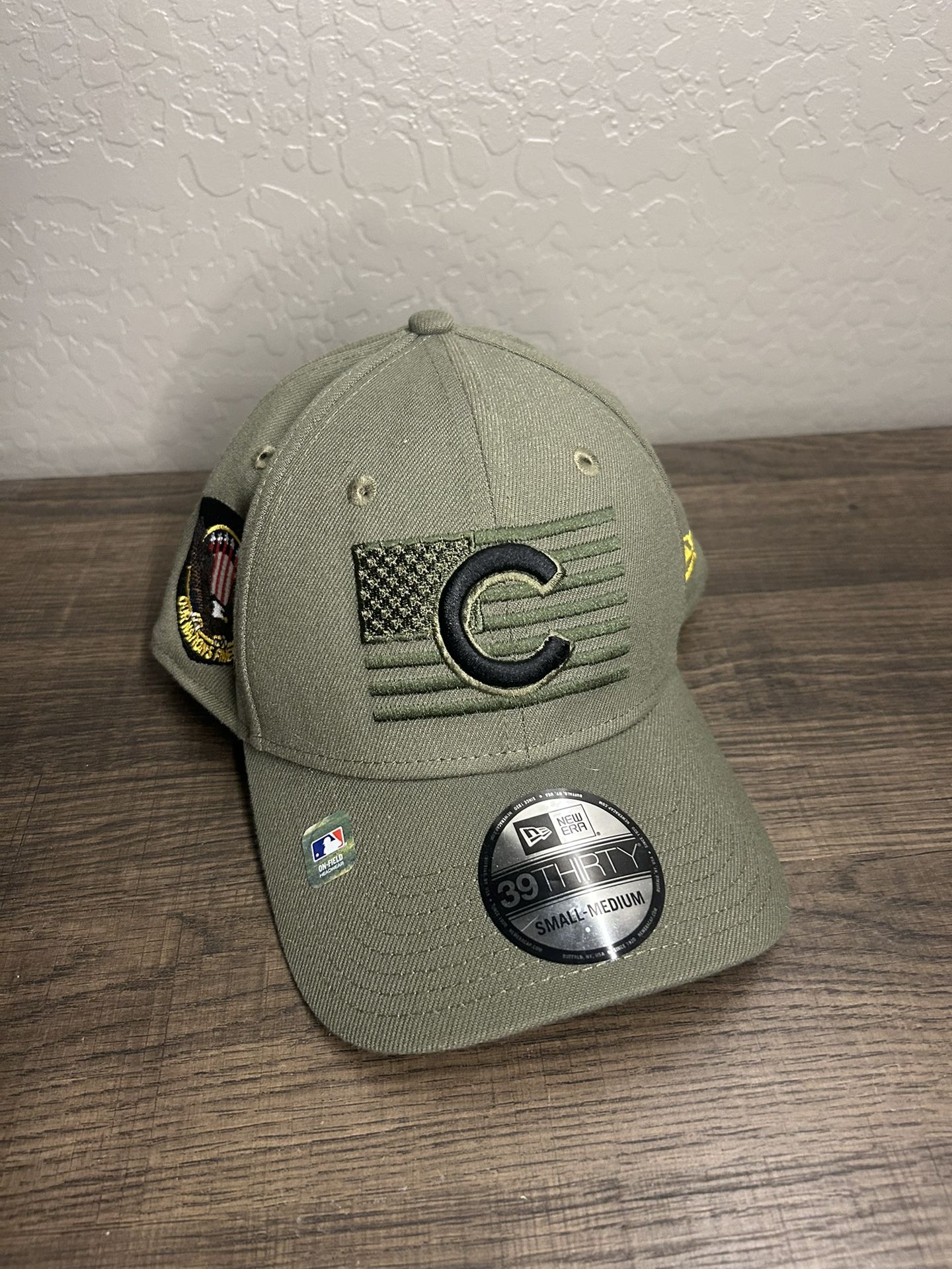 Authentic New Era Chicago Cubs 39THIRTY fitted cap in an olive green military-inspired design. Features a raised Cubs “C” logo with a tonal American flag pattern, MLB On-Field badge, and “Our Nation’s Finest” side patch. Classic stretch-fit comfort with structured crown. Great condition with original stickers still attached.