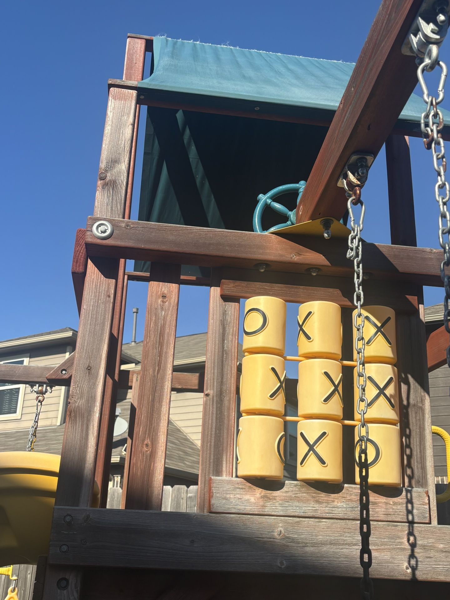 Custom play set! Has rock climbing wall, swings, picnic table, rope climbing, tick tac toe, slide and imaginary play. In great condition. Additional slides can be added onto this set from more fun. Delivery and assembly to your home is included in this price.