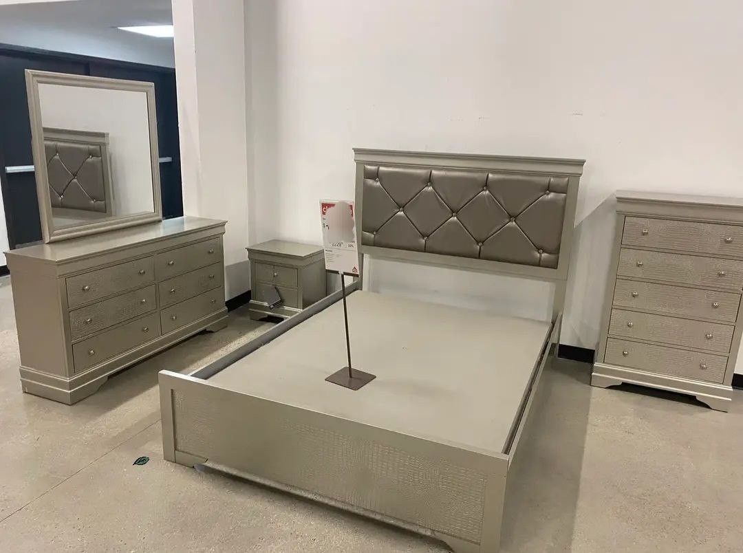 AMALIA SILVER UPHOLSTERED PANEL BEDROOM SET 4-Piece Bed, Dresser, Mirror, Nightstand