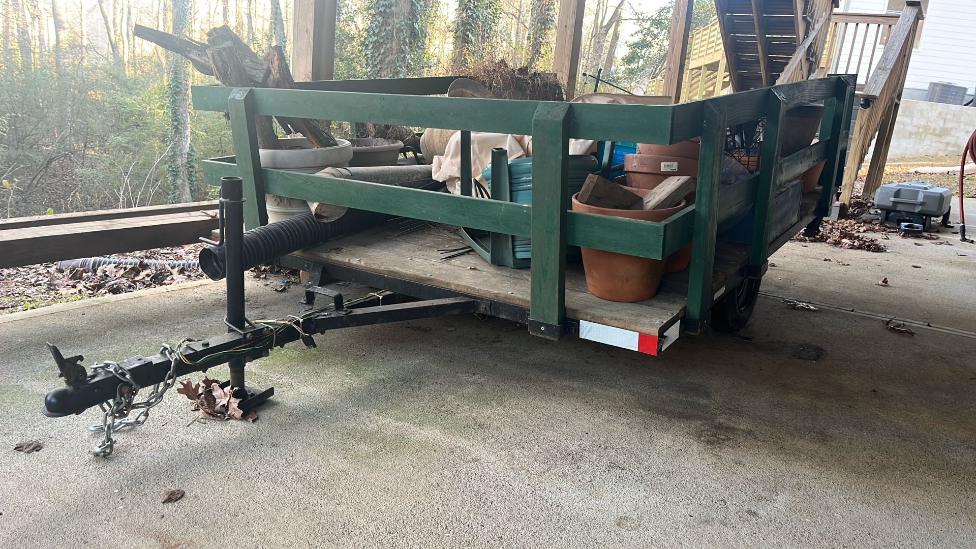 Trailer with 1 7/8” receiver. Was once a camper frame then turned into trailer. 4 pin harness. Registered in Georgia. All pots are being cleared off on 16 December.