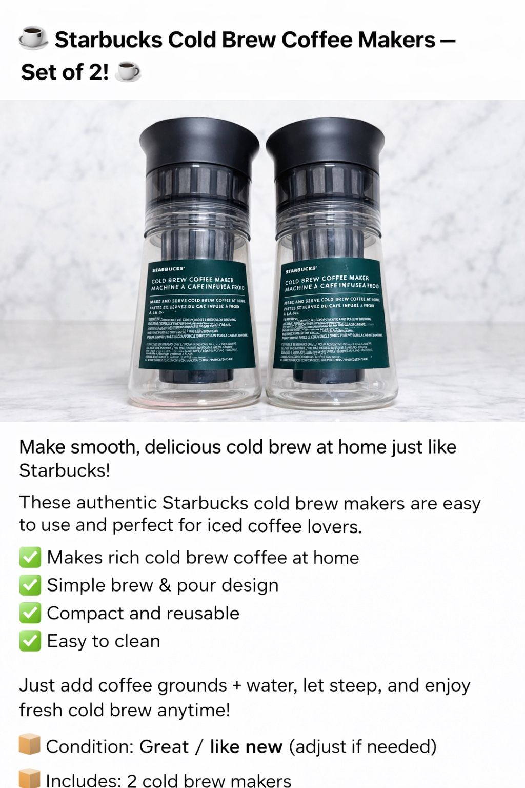 ☕ Make smooth, delicious cold brew at home just like Starbucks! These authentic Starbucks cold brew makers are easy to use and perfect for iced coffee lovers. ✅ Makes rich cold brew coffee at home ✅ Simple brew & pour design ✅ Compact and reusable ✅ Great for fridge storage ✅ Easy to clean Just add coffee grounds + water, let steep, and enjoy fresh cold brew anytime! 📦 Condition: Great / like new (adjust if needed) 📦 Includes: 2 cold brew makers