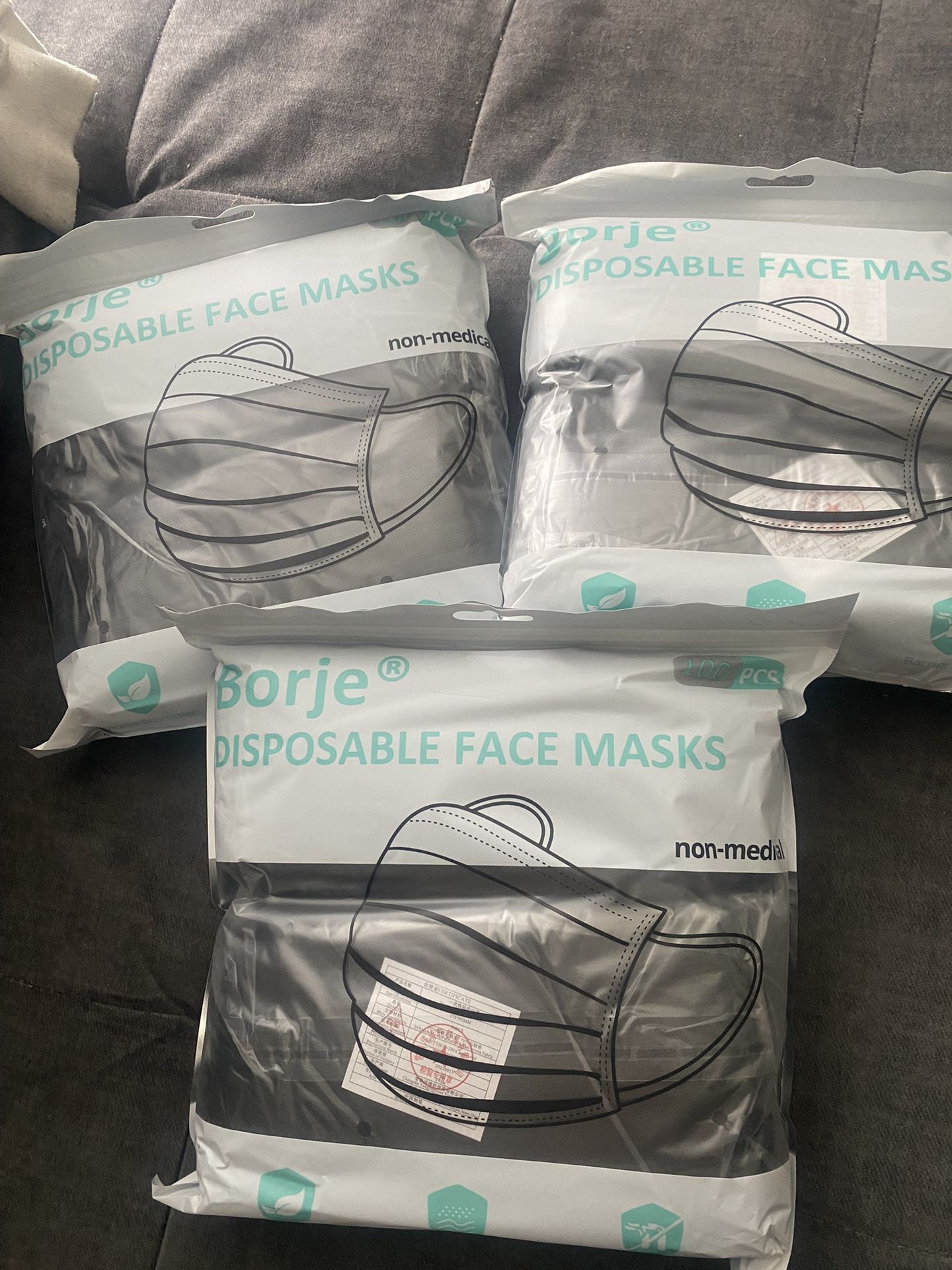 Brand new, unopened. 3 packages of 100 black disposable masks.