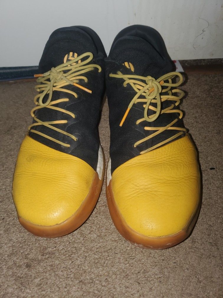 Not free, please just throw your best offer, anything fine just need to get rid of, so first person will get them. Size 12.5 Fair condition, Adidas Harden Vol. 1 black with leather front basketball shoes. Only laces really dirty, if requested I can wash with my shoe cleaner to help lighten them up.