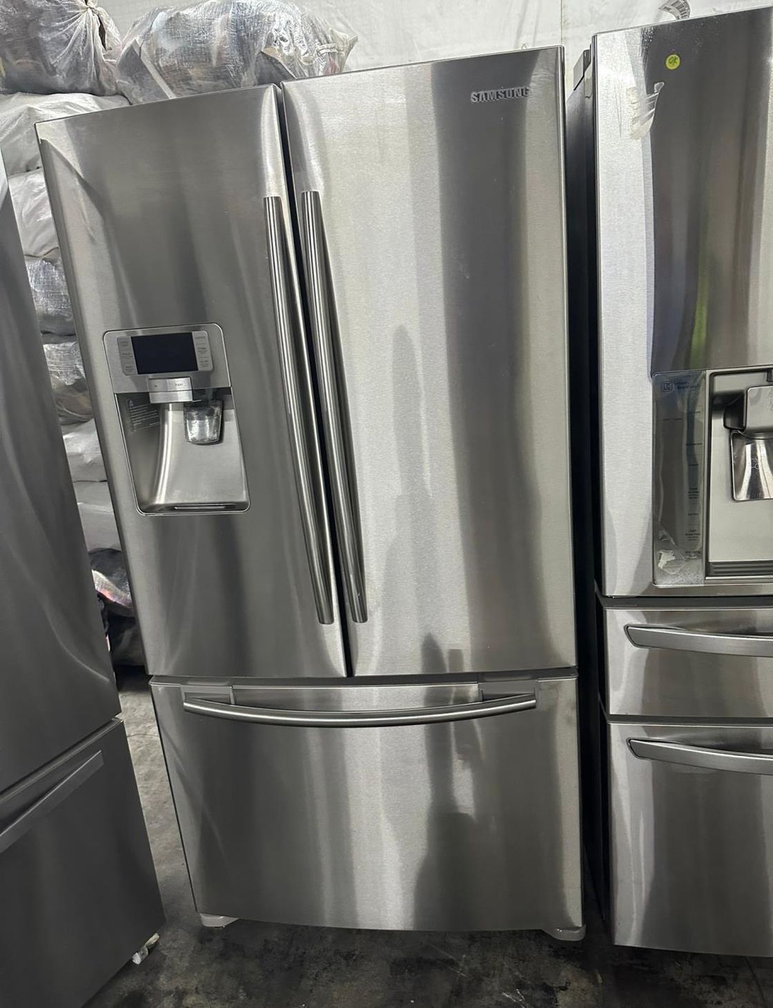 This Samsung French Door Refrigerator in stainless steel offers a sleek and modern design with its elegant French doors and spacious bottom freezer. The appliance is in good condition; only minor external dents are present, while the interior remains clean and well-organized with adjustable shelves and twin cooling capabilities. Comes with 60-day warranty Same day delivery available DM / Message us for more info Hablamos español