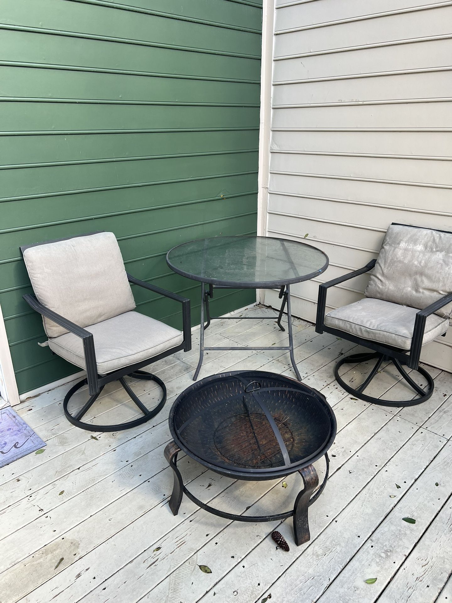MOVING THURSDAY AND MUST SELL! 2 chairs with washable cushions, folding table and a fire pit! Normal wear and tear. You must pick up and haul. $150