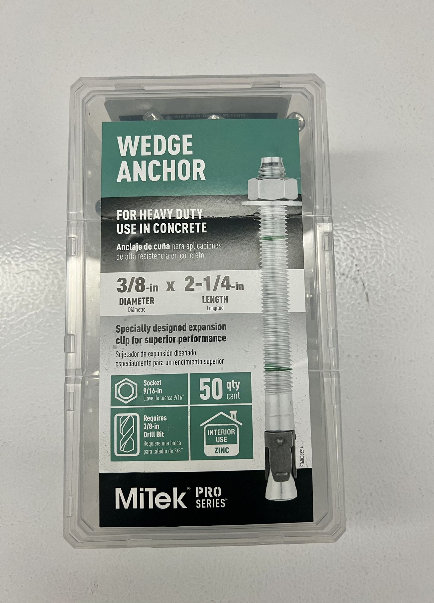 Brand New Mitek Wedge Anchors 3/8in x 2-1/4in Quantity Of 50 FOR HEAVY DUTY USE IN: CONCRETE | BLOCK | BRICK Anclaje de cuña para aplicaciones de alta resistencia en concreto Each box comes with 50 wedge anchors La caja viene con 50 anclajes de cuña