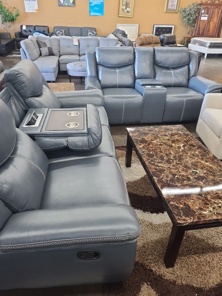 Dual reclining sofa with drop down cup holder with isb charging. Loveseat with console