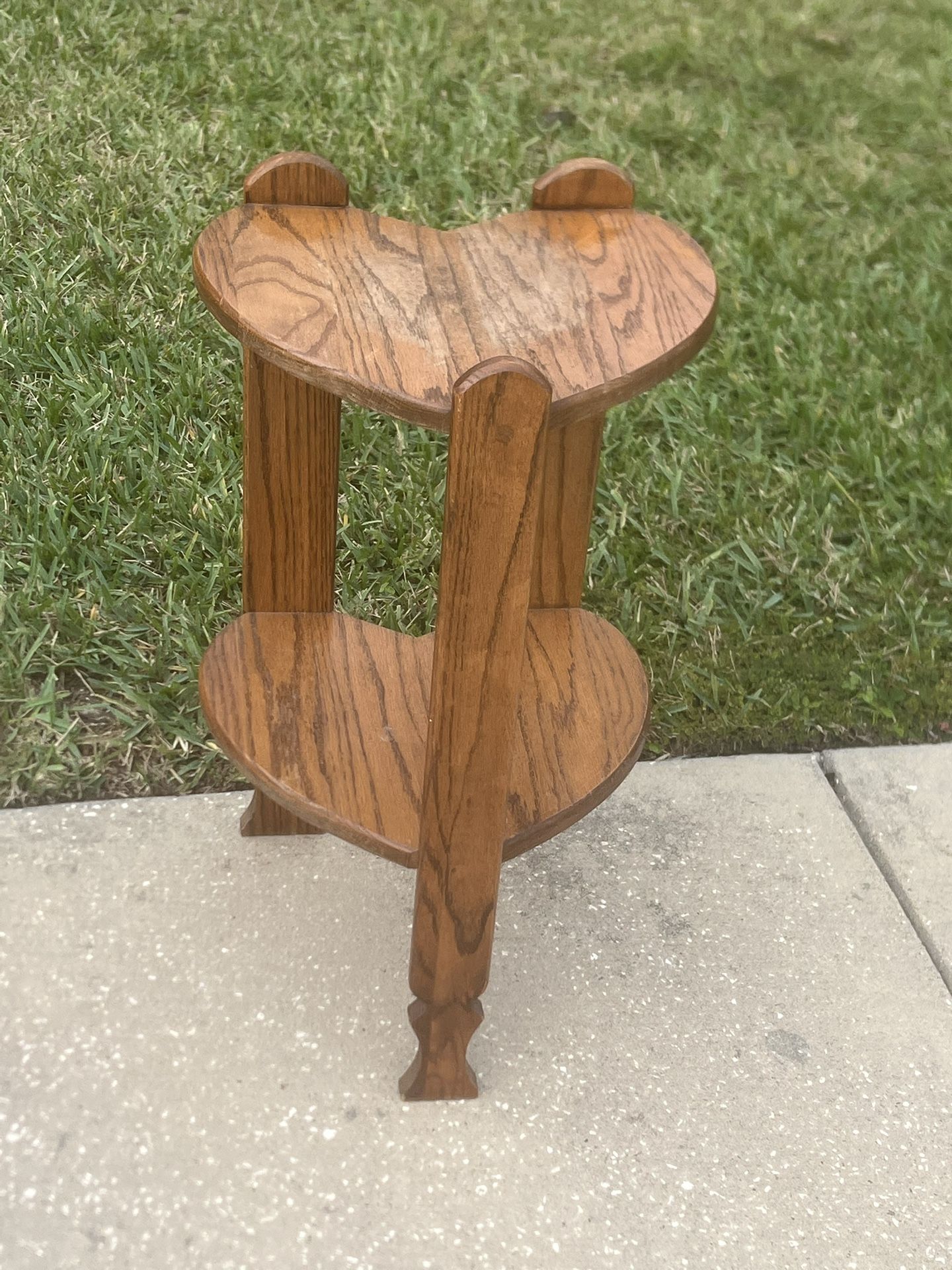 Vintage Heart Shaped Pedestal Plant Stand Mission Oak Arts & Crafts 2 Tiered Used in good condition with some cosmetic blemishes. These blemishes are in the form of scratches and scuff marks associated with normal usage and time(age of the item)