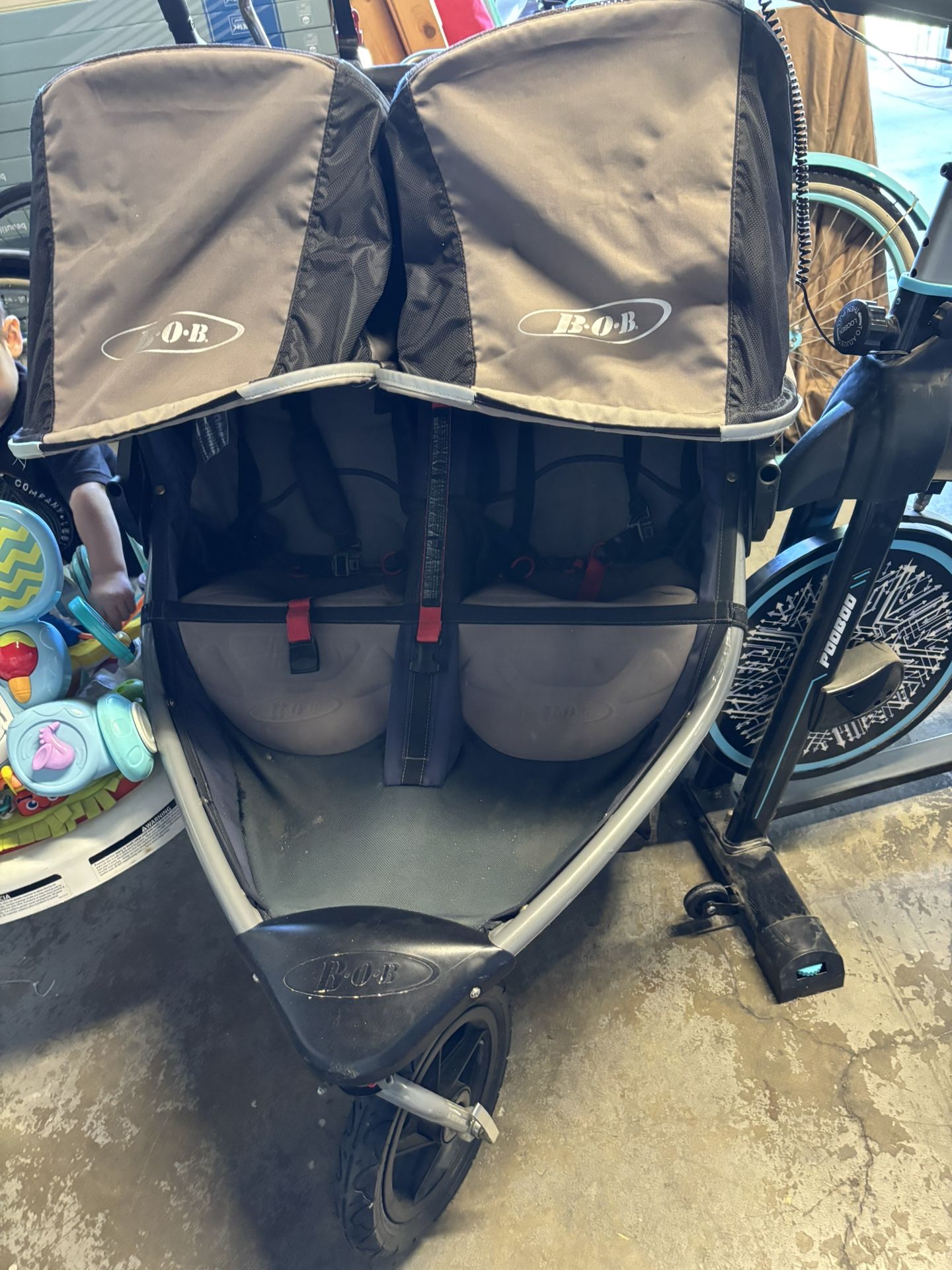 Works great, just a little faded from the sun. There is a ripped strap, I’m not sure what it’s for. It folds up and there’s another strap that holds the stroller shut still. Tray attachment included. One attachment is for a Britax infant car seat. This stroller is the best for runners.