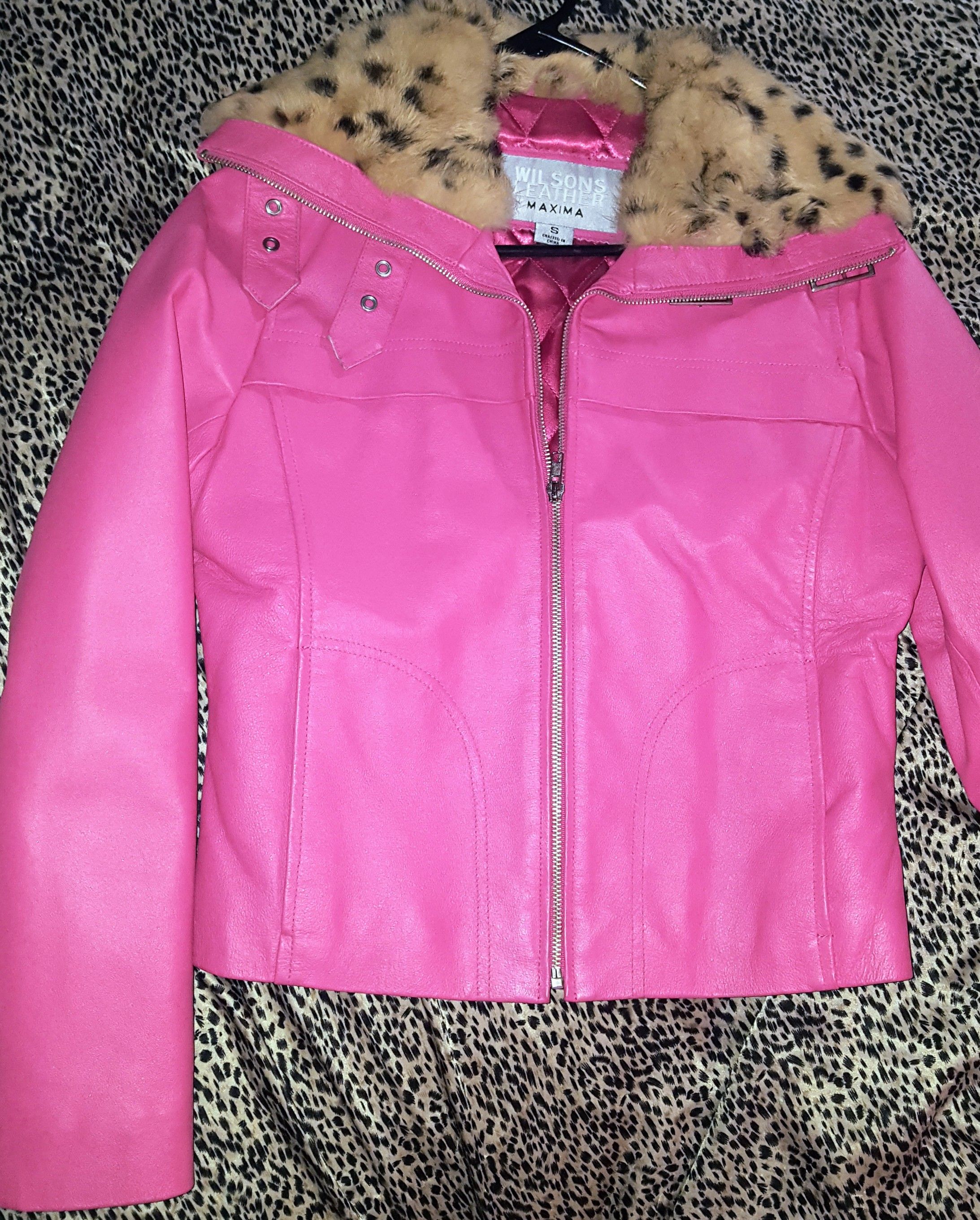 Worn ONE time around my house, to try on only, after I received it as a gift; technically brand new! Therefore absolutely no evidence of wear on any of the leather. Womens size medium. Pink genuine leather outer shell and inside is insulated with pink quilted polyester lining. Leopard rabbit fur convertible collar with buckles to allow for the extremely soft rabbit fur to "hug" your neck for extra warmth; and gives a different look entirely to the jacket. On-seam slash pockets on both sides. Full zipper closure. Excellent condition! (I also have a wilsons genuine leather matching pink newsboy cabbie style cap [listed as well- never worn] should you be interested in purchasing both of the items).