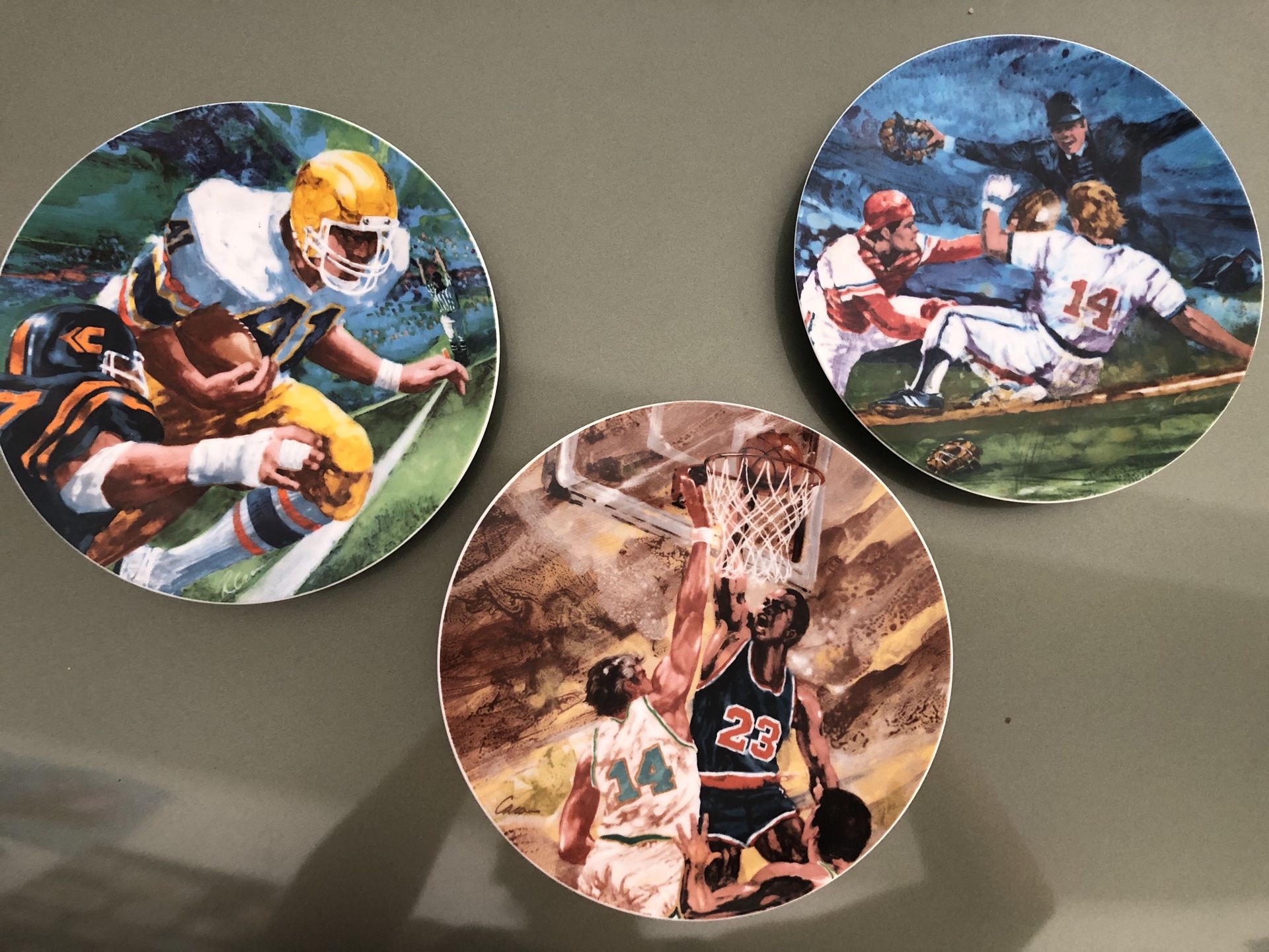 Vintage collectible plates from Avon 1985 Moments of Victory Collection. Approximately 7 inches. Basketball plate needs hook to be reattached.