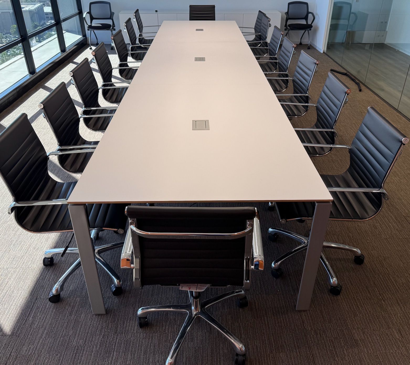 We have this 18′ x 4′ x 30″ Watson conference table in excellent condition. Features three integrated power/data/USB stations, beveled edges, and a modern angular frame—perfect for large meeting rooms or collaborative workspaces. Solid build and ready for use. Message for pricing and pickup details.