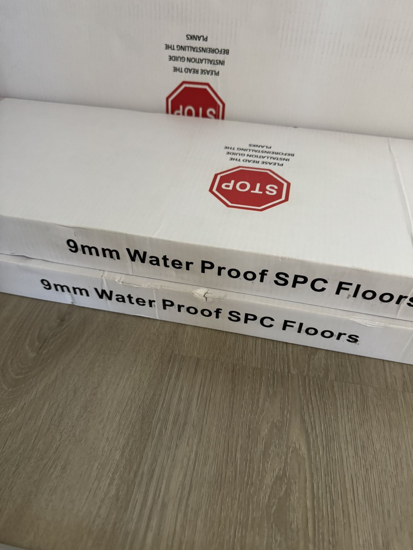 I have 4 boxes of SPC flooring which is 9mm commercial grade. Also 1 8ft T molding. Flooring was $70 a box. 23.98 SF/Box