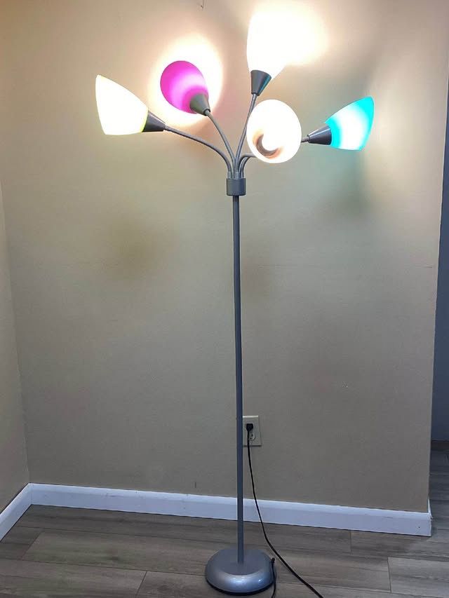 Floor Lamp - with 5 Lights - Multi Color Shades-Metal Silver Finish Equipped with five flexible gooseneck arms with adjustable lighting Silver finish with multicolor plastic shades 4 way turn knob Stands over 67 inches tall with 9 inch base Works great and is in excellent condition Smoke Free and Pet Free Home Pick up in downtown Flushing, MI Cash only