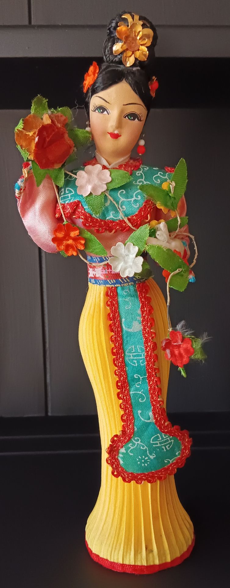 Vintage Asian Geisha Souvenir Doll With Wood Base 11 Inches Tall.