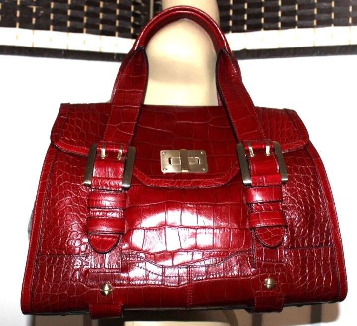 MAXX New York Luxe Red Croco Satchel size 15.5" x 7" x 10.5", 6" handles drop Premium cowhide leather, dark red hue, rich croco-embossed pattern, polished champagne hardware, protective bottom studs, buckled straps, flap with turn-lock closure, metallic black luxe linings, one zip and two slide pockets. *Please note that this is a high-end quality bag made of thick luxurious leather, ~Not lightweight or flimsy mass-production quality~. The perfect office, business woman bag with plenty of room for documents and tech! 100% AUTHENTIC Smoke and pet free home Contact me if you have any questions THANK YOU:-)