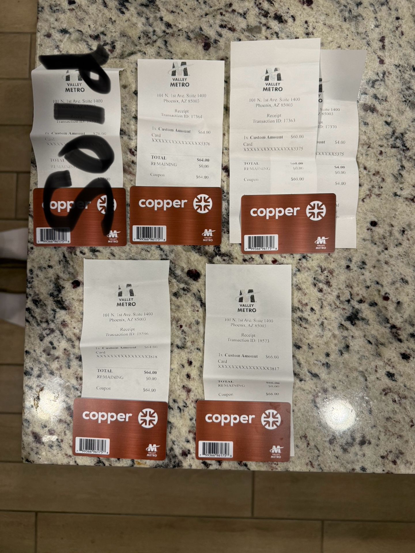 I have 4 Copper Cards for sale that have enough money on them to be monthly passes. The receipts pictured show the actual amount loaded on them. Can be used for the light rail or any city bus. Only asking $50 or best offer. Just make me an offer close and it’s yours. Please let me know if u are interested or have questions. Thank u.