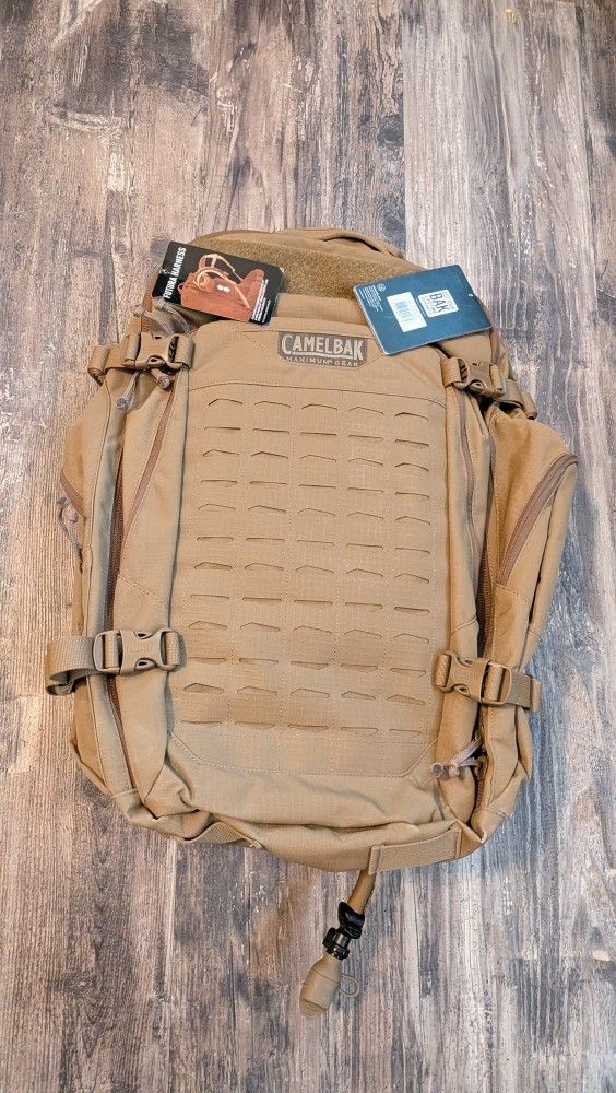 This CamelBak BFM Mil Spec Crux is new with tags. It's never been used. Details LE1473 COY | Specs Quick Link System Futura Harness and Sternum Strap adjust to fit long and short torsos Four zippers on main compartment allow for multiple access points Side release buckles for quick release from shoulder harness Low-profile Mountain™ MOLLE panel for attachment of accessory pouches Upper and lower compression straps to secure load Insulated reservoir pouch with multiple ports Large main compartment with clamshell zipper 500 D Double Rip Cordura Total Capacity: 50L Cargo Capacity: Up to 57 L Reservoir Capacity: 3L BPA/BPS/BPF Free Dimensions: 22.8 x 18.9 x 15 in Pack Weight: 5.6 lbs Mfg Number: