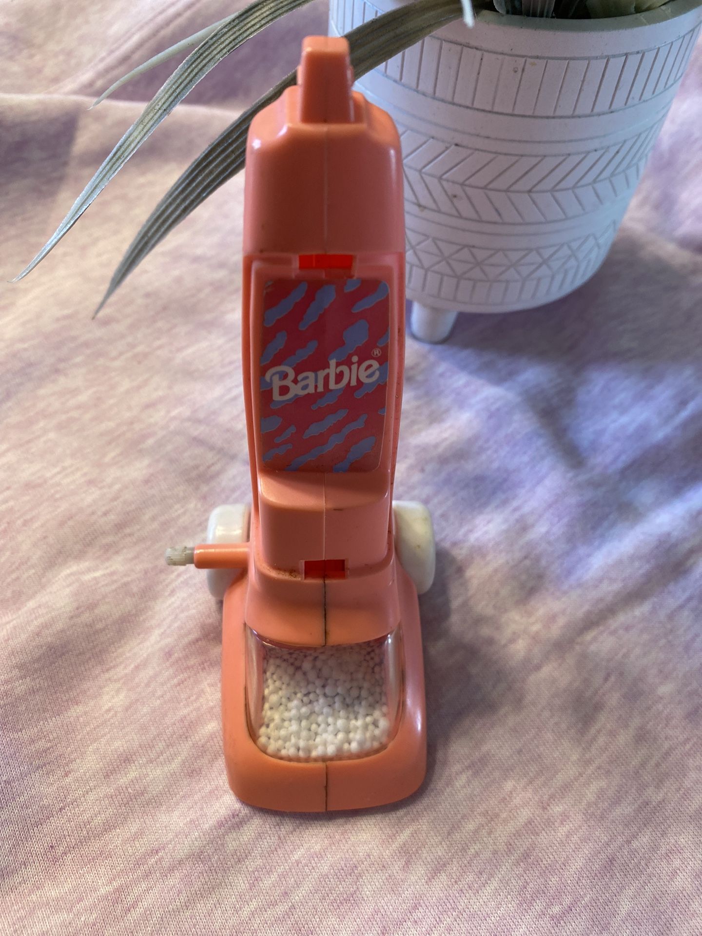 Vintage '92 Magic Moves Barbie doll pink pop vacuum cleaner. This vacuum pops when you manually move it, and it pops AND moves when wound up when it wants to lol. *Missing top white handle and clear front cover. - vintage toy toys pretend play y2k 00's collectible