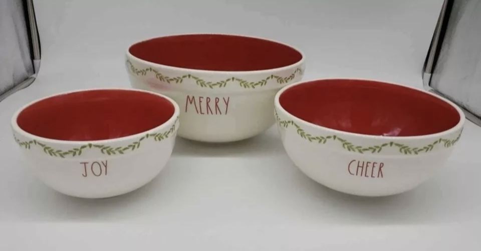 This set of Rae Dunn Christmas Garland Merry, Cheer, Joy Mixing Bowls is a rare find for any collector or fan of Rae Dunn pottery. The set includes three round ceramic mixing bowls with Christmastime patterns and the words "Merry," "Cheer," and "Joy" in the iconic Rae Dunn font. These bowls are perfect for any Christmas occasion, whether for baking or for decoration. The bowls are multicolored and have a festive design that will add a touch of holiday cheer to any home. This is a must-have item for any Rae Dunn enthusiast or anyone who appreciates unique and rare home decor pieces. *You can rest assured that these will be packaged well.