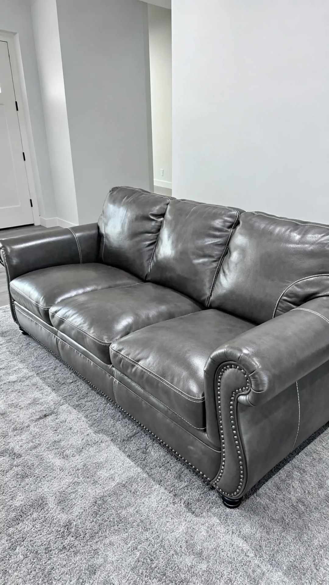 Premium Grey Leather Couch – Free Delivery Included Elegant nail-studded detailing with a modern, timeless design. Crafted from genuine leather that’s soft, supportive, and built to last. In amazing used condition with minimal wear — the quality is obvious the moment you sit down. Some m Wear on front bottom edges Perfect for any living room that deserves both comfort and style. Free delivery with asking price. Browse my page for more high-quality couches available today.