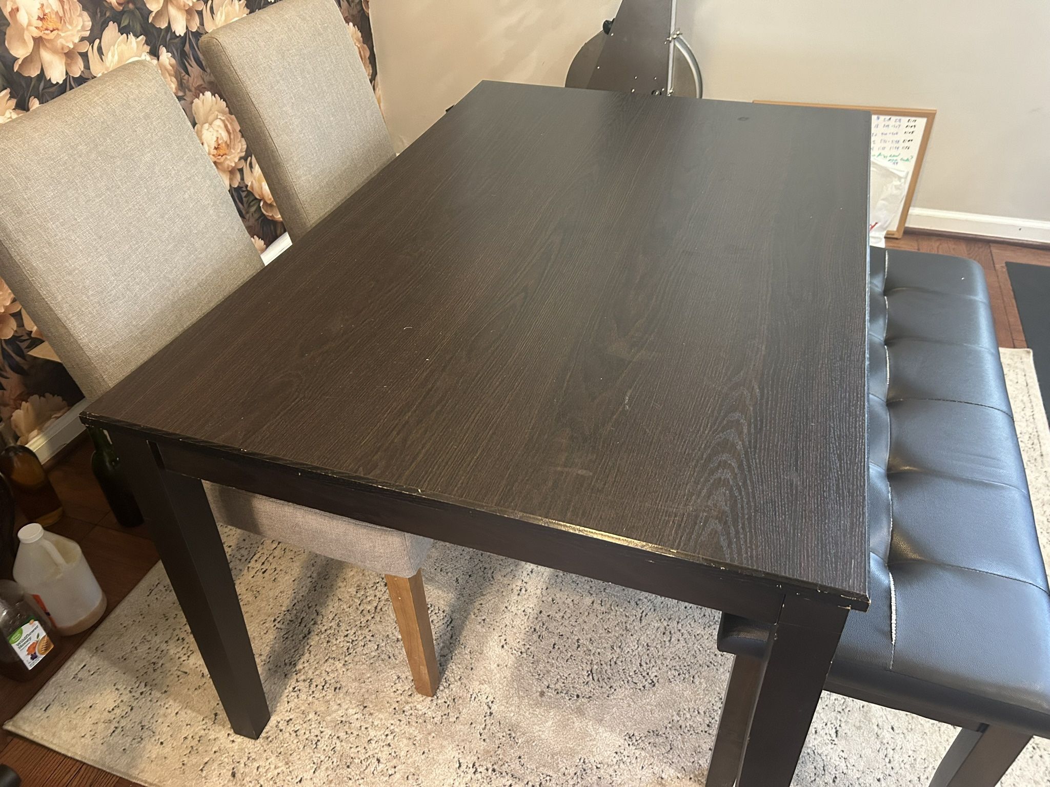 Table that comes with a bench and two chairs. Length 54” Width 36”