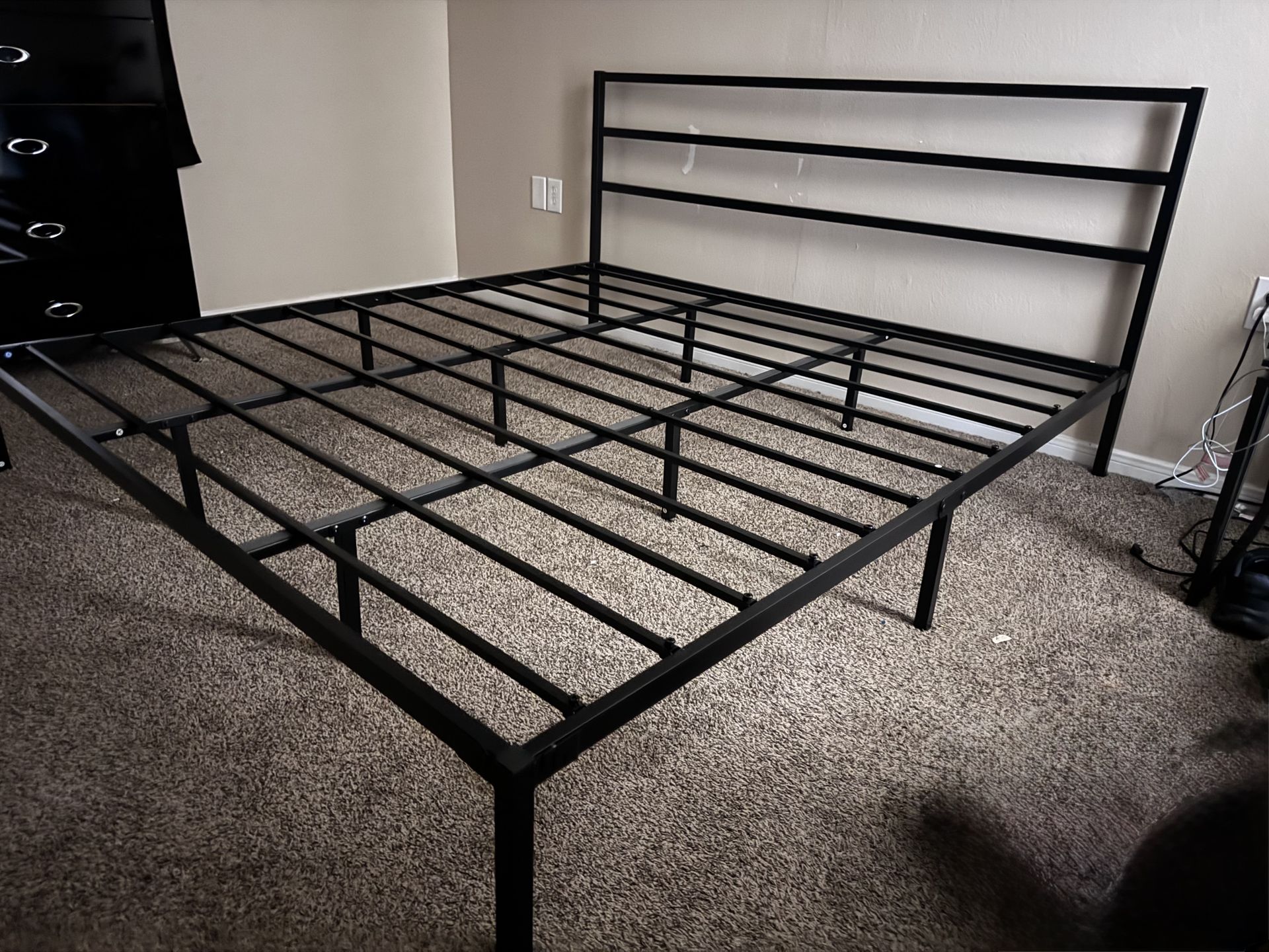 Metal king size bedframe. All screws are good and included. Easy assembly. Need Allen wrench. I'm only available on weekends.