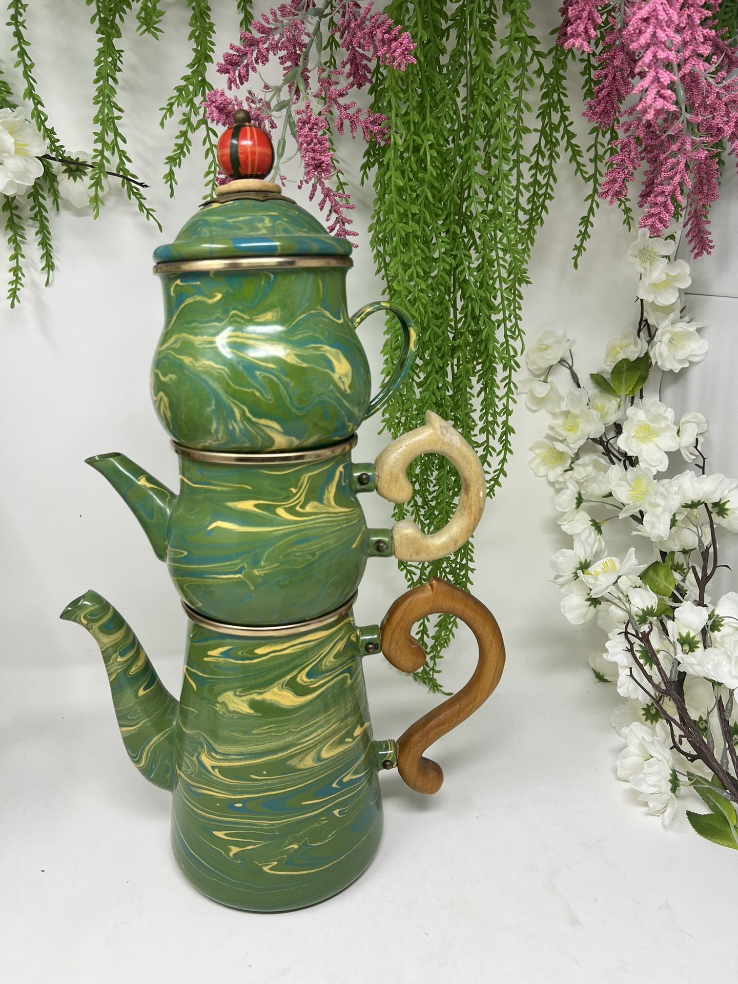 Beautiful green marbled swirl glaze with whimsical carved wood handles and the signature decorative knob. This is an early Mackenzie-Childs piece, no longer produced and highly collectible. Excellent condition β stunning display and a true conversation piece. β¨ Price: $285 (excellent deal for collectors) π Pick up in Pinellas Park