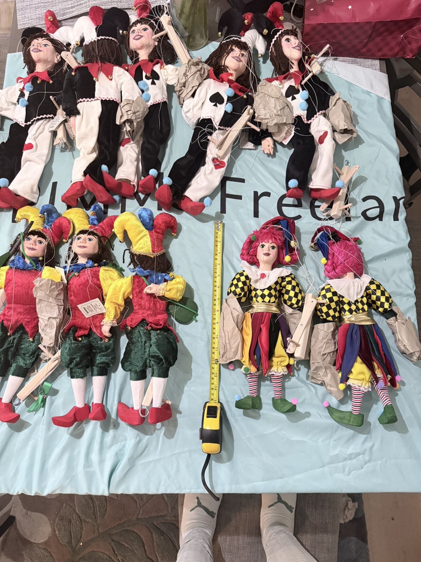 Original Czech Marionette Dolls. These are brand new and were only taken out of the box for photos. All puppets include the wooden control bars and string mechanisms, so they are fully usable (not just for display). ✨ Great for: Collectors • Décor • Theater & stage props • Puppet lovers • Resellers • Gifts 📌 Bundle Includes: • 10 marionette dolls total • Wooden controllers + strings included • Characters include jesters/harlequins in multiple costume designs (black/white jester set + colorful harlequin costumes) • Approx size: 18–19 inches tall (see tape measure in photos) • Some dolls have tags that say “Original Czech Marionette” ✅ Condition: • NEW / UNUSED • Only removed from packaging for pictures • Stored safely / clean condition • Strings are intact and ready to use