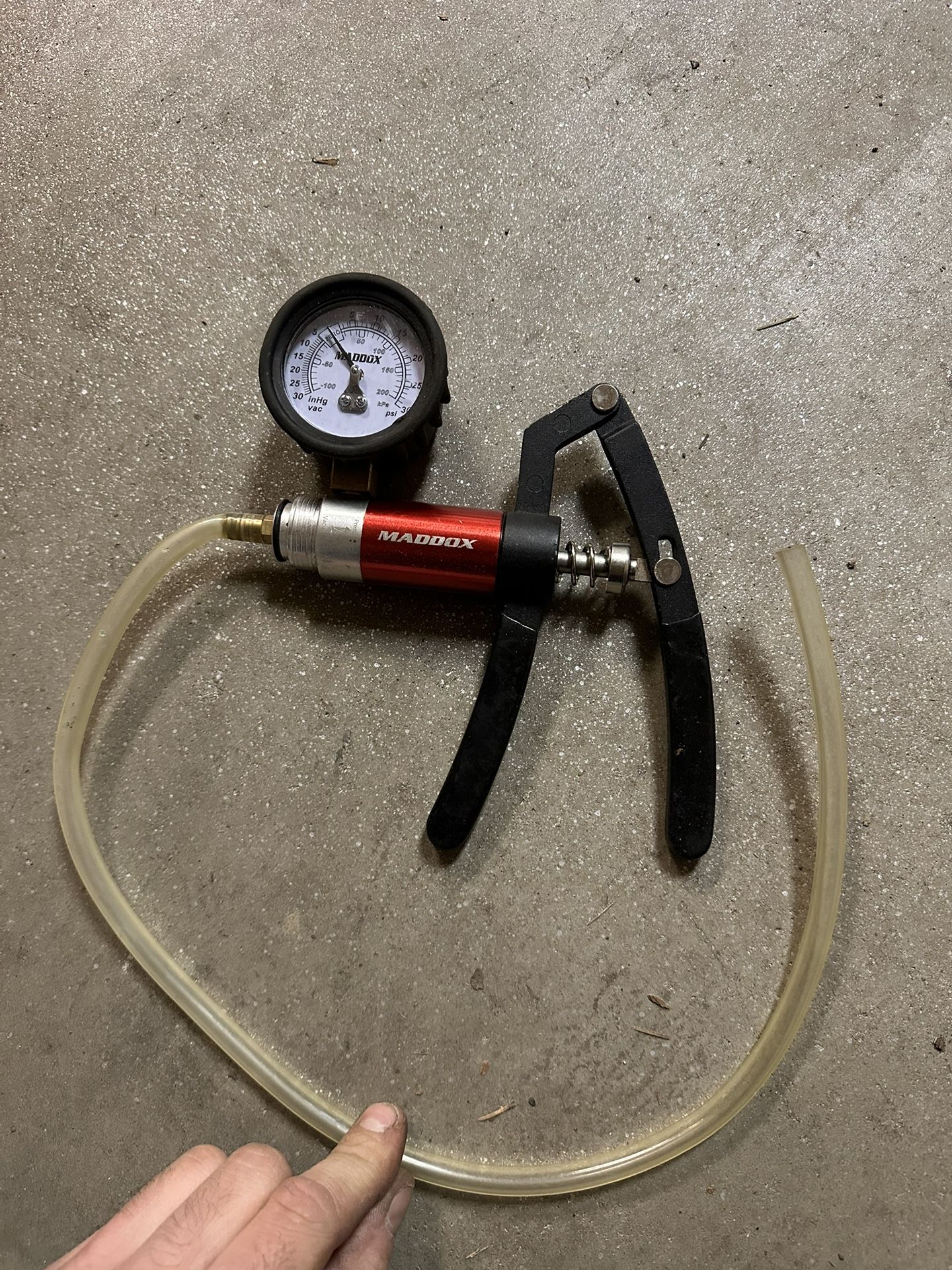Maddox Hand Vacuum Pump with Gauge Maddox manual vacuum/pressure pump with built-in gauge and hose. Ideal for brake bleeding, vacuum testing, and automotive diagnostics. Used condition, works as shown.