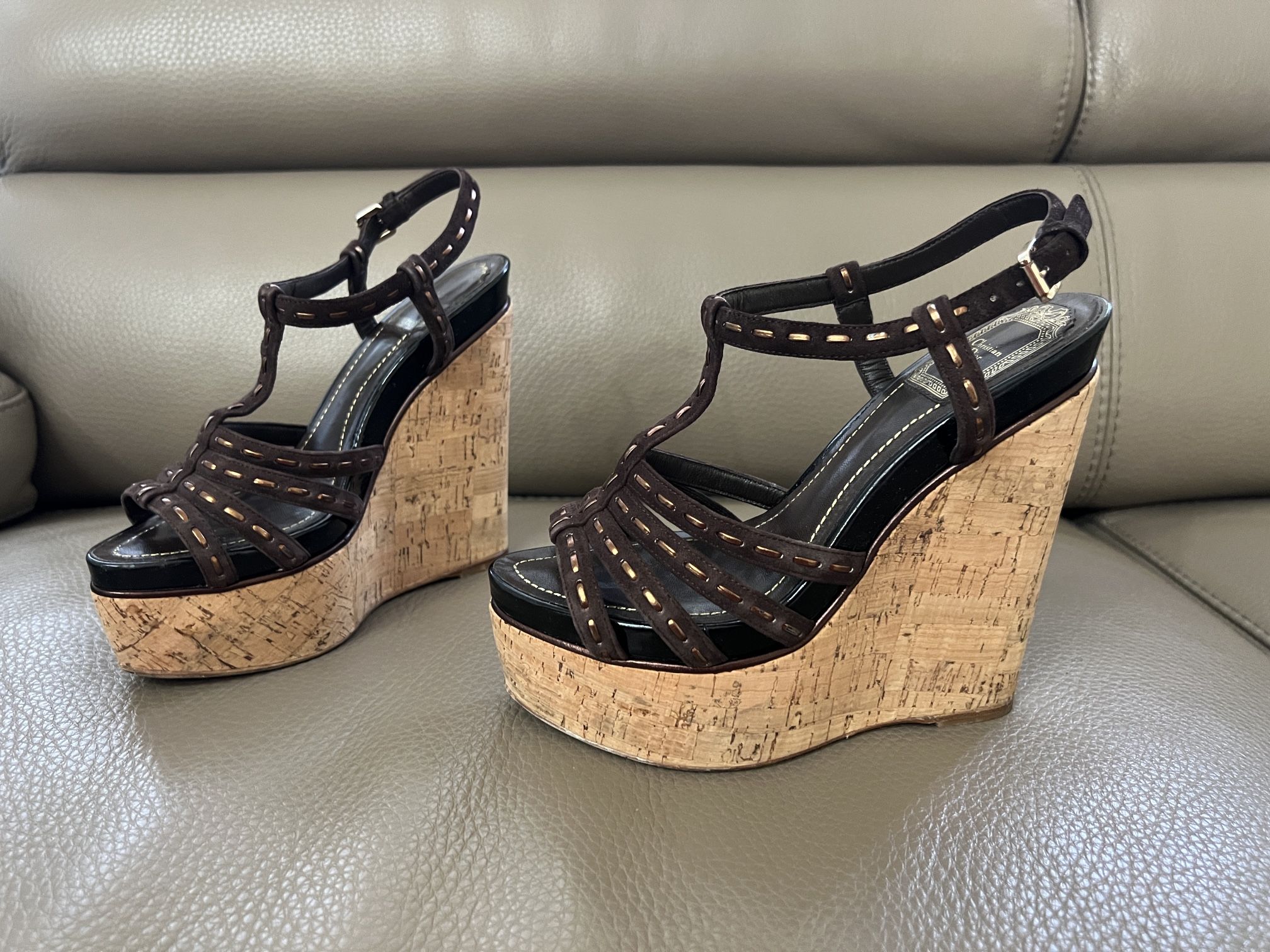 CHRISTIAN DIOR Brown Suede Antica Cork Wedge Sandals Size 6/36
