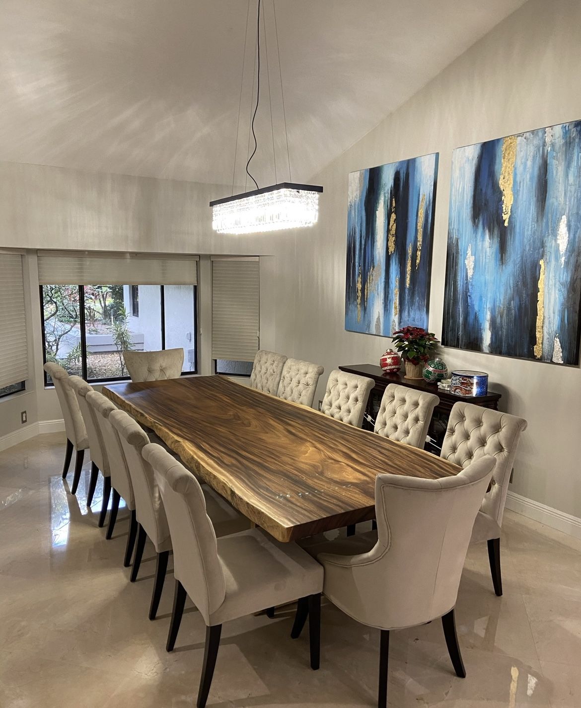 Hello, We have over 400 raw slabs to choose from. We go after high figured slabs with crazy grain action. Come by our showroom to custom build your piece. We do it all..... floating shelves, dining tables, conferences tables and bar tops! All of our exotic hardwoods have been kiln dried, fed through a wide belt sander at 100 grit and leveled. We sell $30 a board foot raw and an additional $10-$15 a board foot to finish. Bulk pricing available, message for rates! Ask about our epoxy resin work! We specialize in river tables. Thank you, Combat Veteran Owned and Operated! We are located at 2208 Mears Parkway Margate Fl 33063 Mon-Sat from 8am-3pm