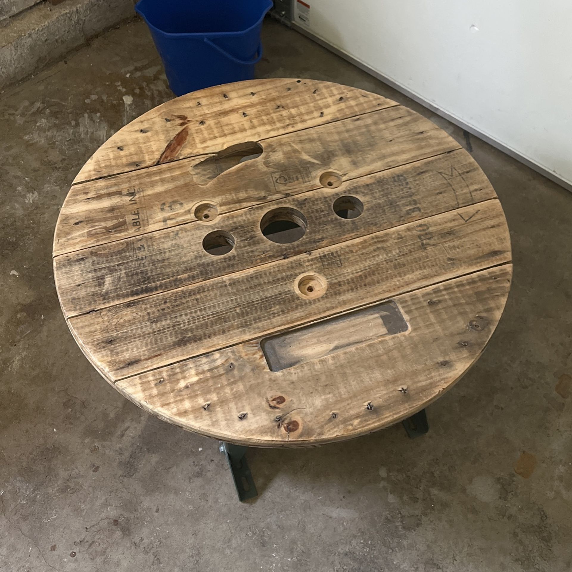 Cable spool custom table with adjustable legs and feet . Perfect condition $60