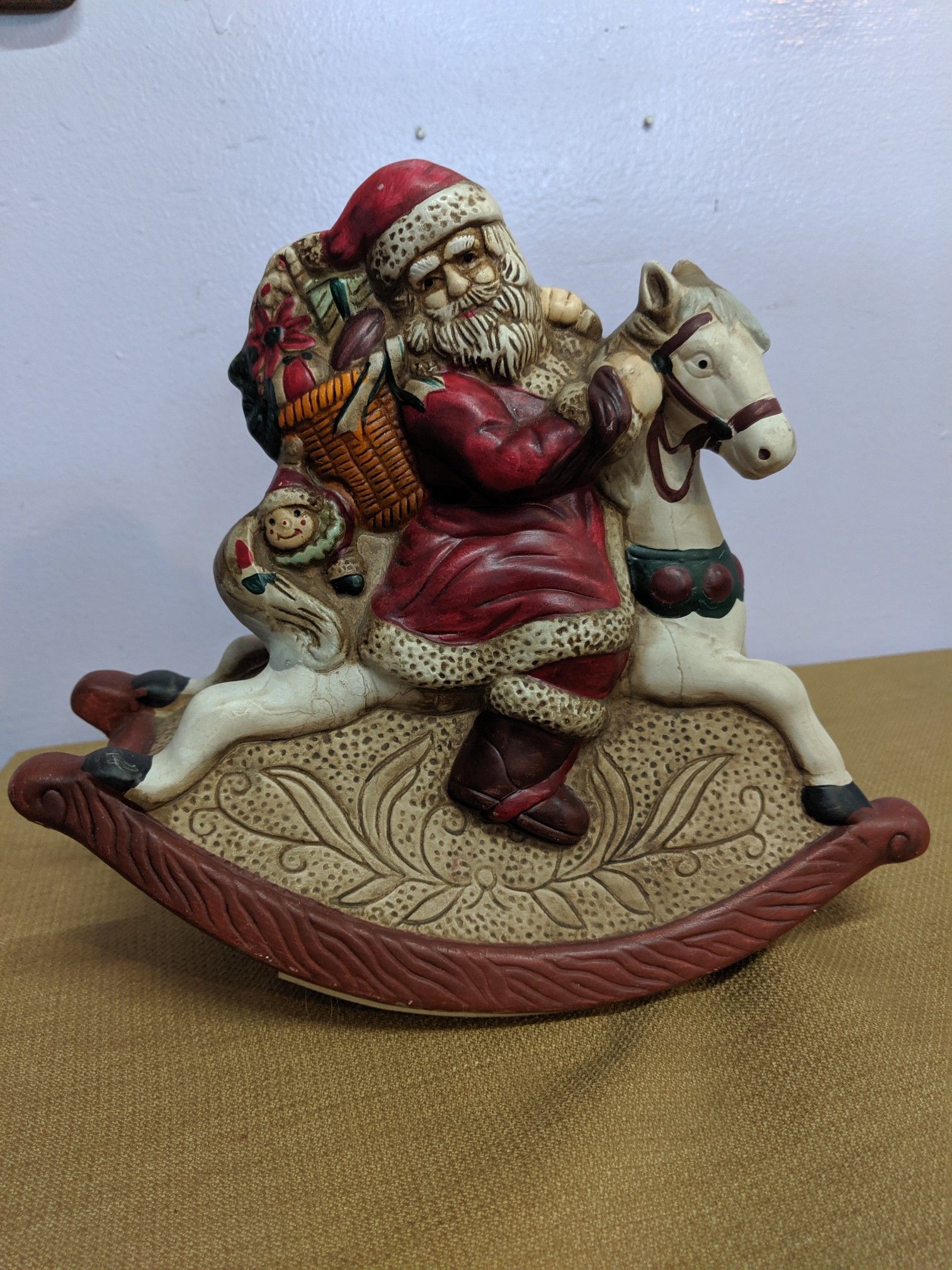 Vintage Ceramic Musical Santa on a Rocking Horse . Slowly rocks back and forth and plays " Santa Claus is coming to town" . Excellent Vintage Condition. Made in Taiwan. Comes in original box. $25.00