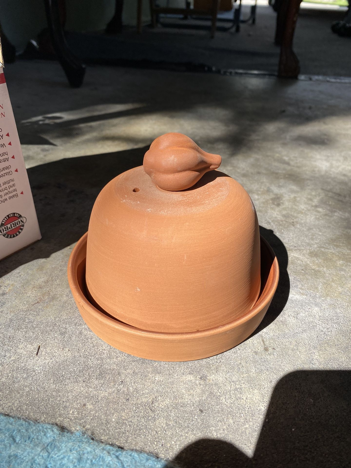 Never used! It is made of terra cotta with a glazed base for easy cleaning The baker is designed to roast garlic, but can also be used to roast other items like onions or apples The lid has a steam vent to prevent the garlic from becoming mushy