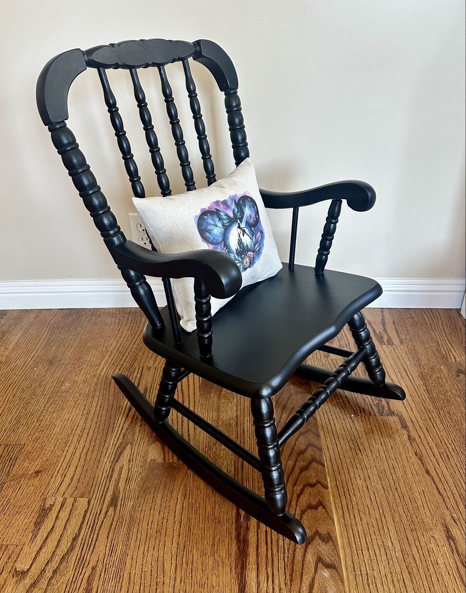 Child’s Rocking Chair. Painted black and adorned with a Disney Tinker Bell inspired pillow. Fits most children from ages 2-7. Pick up in San Jose, 95125. CASH ONLY.