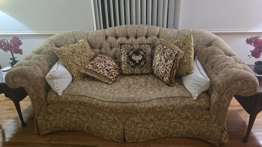 Elegant Victorian-style curved sofa featuring button tufting, rolled arms, and a graceful conversation-style silhouette. Upholstered in a gold/beige damask fabric with ornate detailing. Solid wood frame with dark-finish carved legs adds a classic, timeless look. ✨ Includes decorative accent pillows with black-and-gold baroque/Versace-style designs ✅ Great statement piece for a formal living room or sitting area 💲 Only $50 📍 Pickup only: 208 Telford Drive, Newport News, VA 23602 📅 Must be picked up before Jan 15 Message if interested—amazing deal and priced to sell quickly!