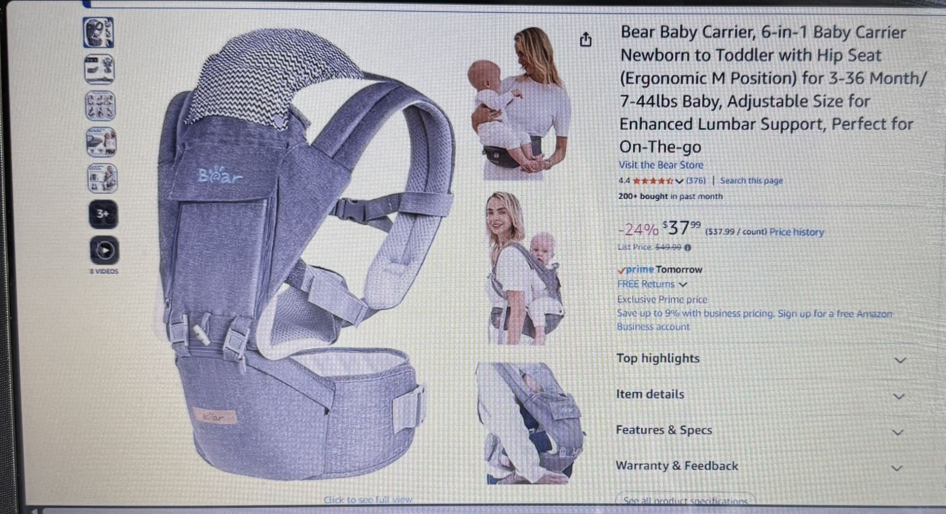 Bear baby carrier. BRAND NEW. Never used! 6 in 1. Newborn to toddler with hip seat. 3-36 months. 7-44lbs.