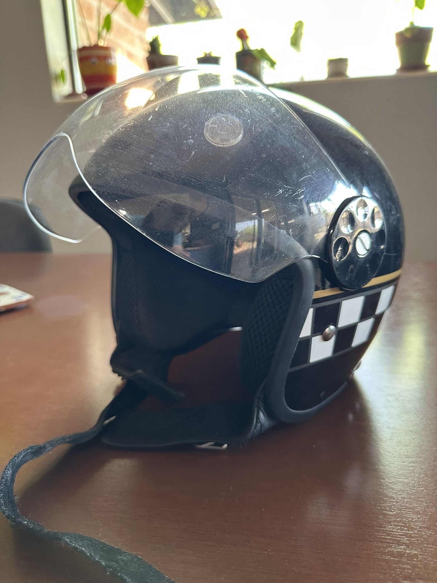 Size small scooter helmet with visor. It has some scratches on the helmet and visor.