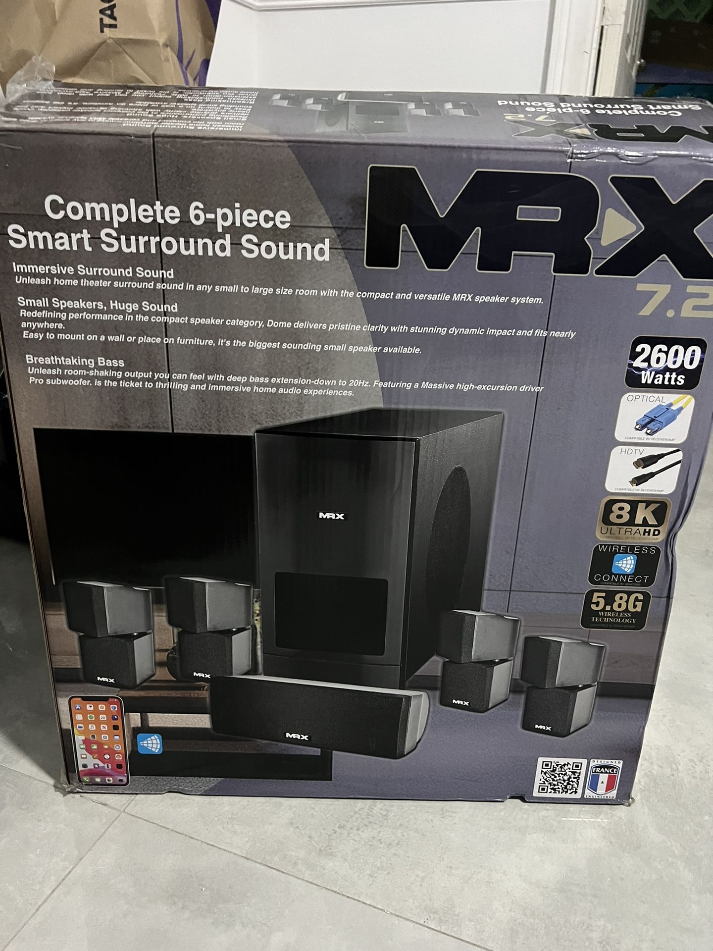 Mrx 7.2 Complete 6 Piece Surround Sound. 2600 watts. Brand new never used. Wireless connect.