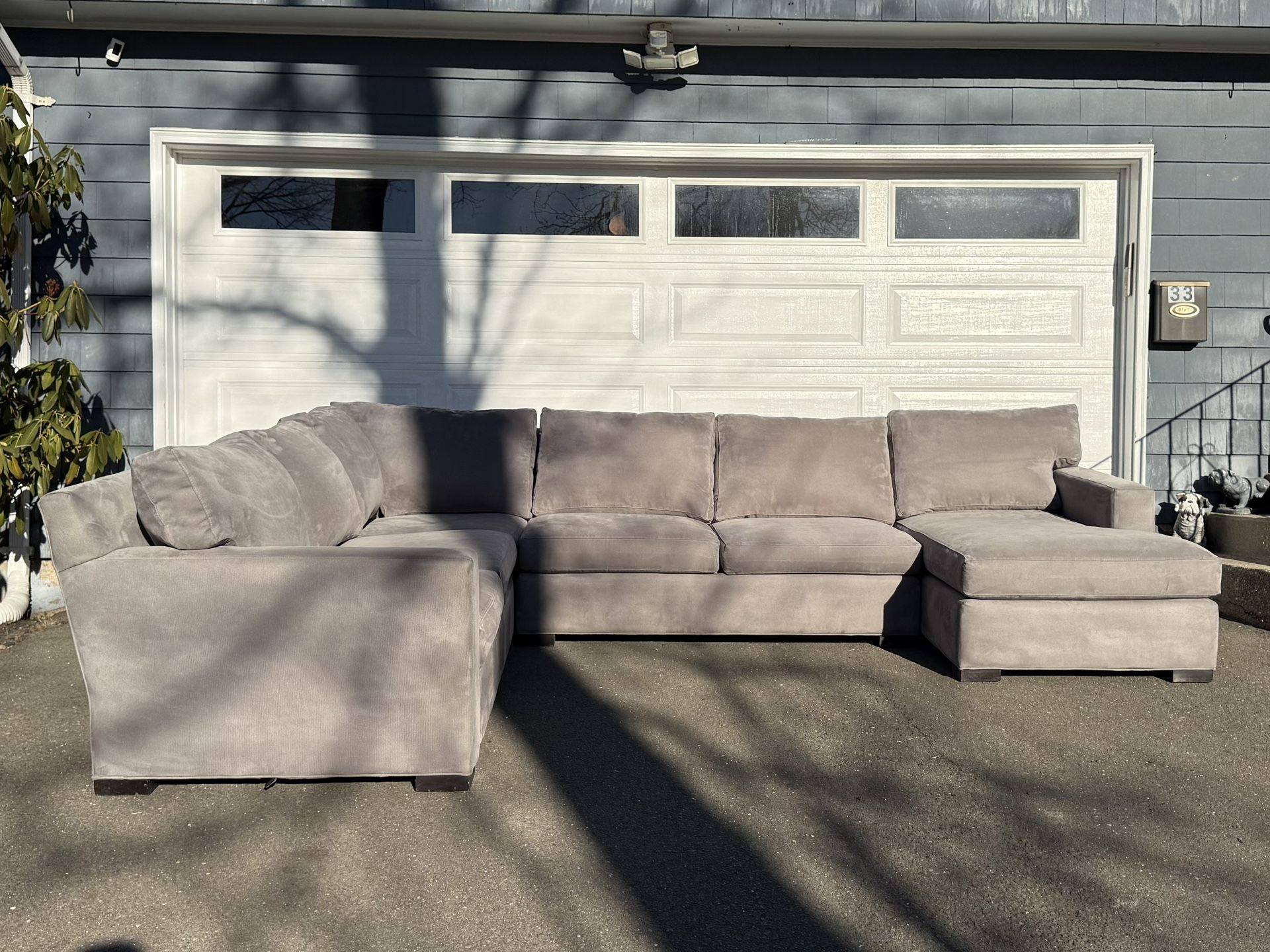 What I’ve got here is a beautiful used Crate and Barrel Axis 4-Piece L-Shaped Sectional Sofa with Chaise Lounge for sale. Overall Dimension Width: 142" Depth: 113" Height: 32" just cleaned and sanitized. Restored and Restuffed and all the cushions so they’re super comfortable. The quality and comfort of this Axis collection is legendary. Casual and inviting, the sectional offers exceptional, long-lasting durability. Angled backs and deep seat cushions filled with a plush feather-down blend encourage lounging, while track arms give the sectional the clean look and modern style that make Axis a Crate & Barrel icon. FSC®-certified hardwood from responsibly managed forests Frames are benchmade with hardwood that have kiln-dried to prevent warping Best-of-both-worlds comfort: Seat cushions are supportive plant-based polyfoam wrapped in a soft, sink-in fiber and feather-down blend Fiber-down back cushions provide soft feel Cushions are wrapped in a special ticking fabric that keeps feathers in place while maintaining shape and comfort over time Durable, independently tested, spring-up Flexolator foundation designed to support cushions and eliminate sagging Make it your own by choosing a custom fabric from our wide selection Hardwood legs come in multiple finish options Set: Left-Arm Apartment Sofa, Corner, Armless Loveseat, Right-Arm Chaise Made in USA of Domestic and Imported Materials Free local curbside delivery Retail price is over $6500