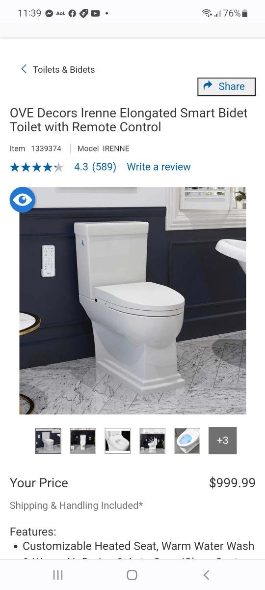 OVE Decors Irenne Elongated Smart Bidet Toilet $800