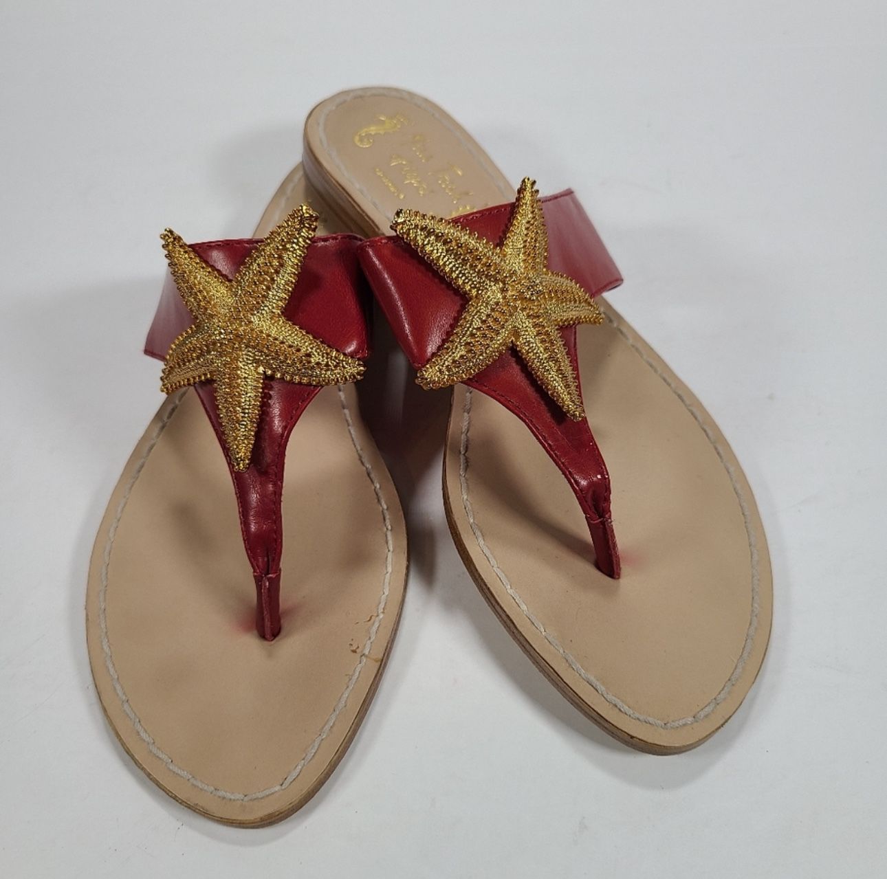 Brand: Miss Trish Style: Starfish Sandal Color: Red/Gold Condition: In great pre-owned condition. See all pictures for details and wear. Size: Women's 6.5 -Man made upper -Leather outsoles -Gold metal Starfish embellishment $40