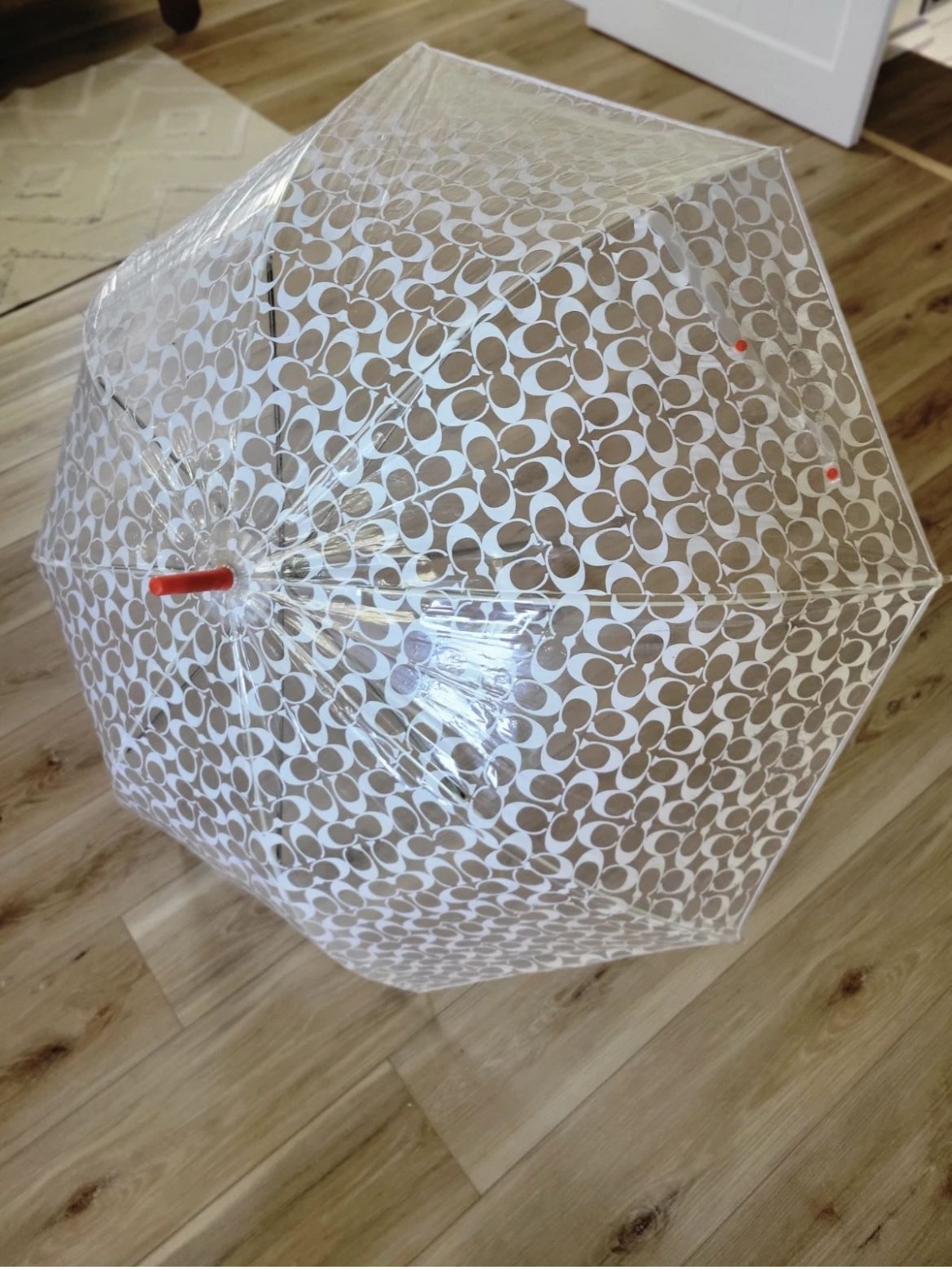 Beautiful and practical Coach umbrella It is hardly being used. it’s a classic, sturdy design with a long, non-collapsible shaft and windproof. You can count on this straight umbrella to be great for keeping rain away when you are out and about. Smoke pet free home.