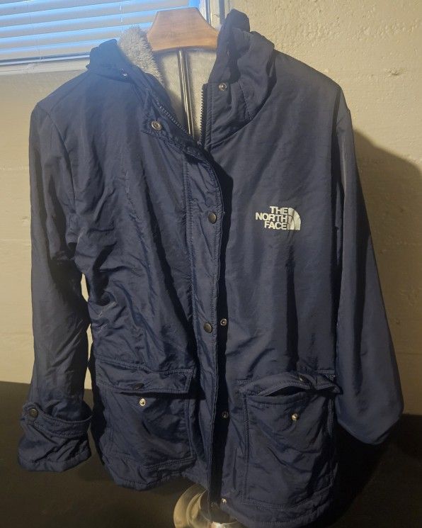 Sz S. Stylish navy jacket by The North Face. Features a sleek design with button details.