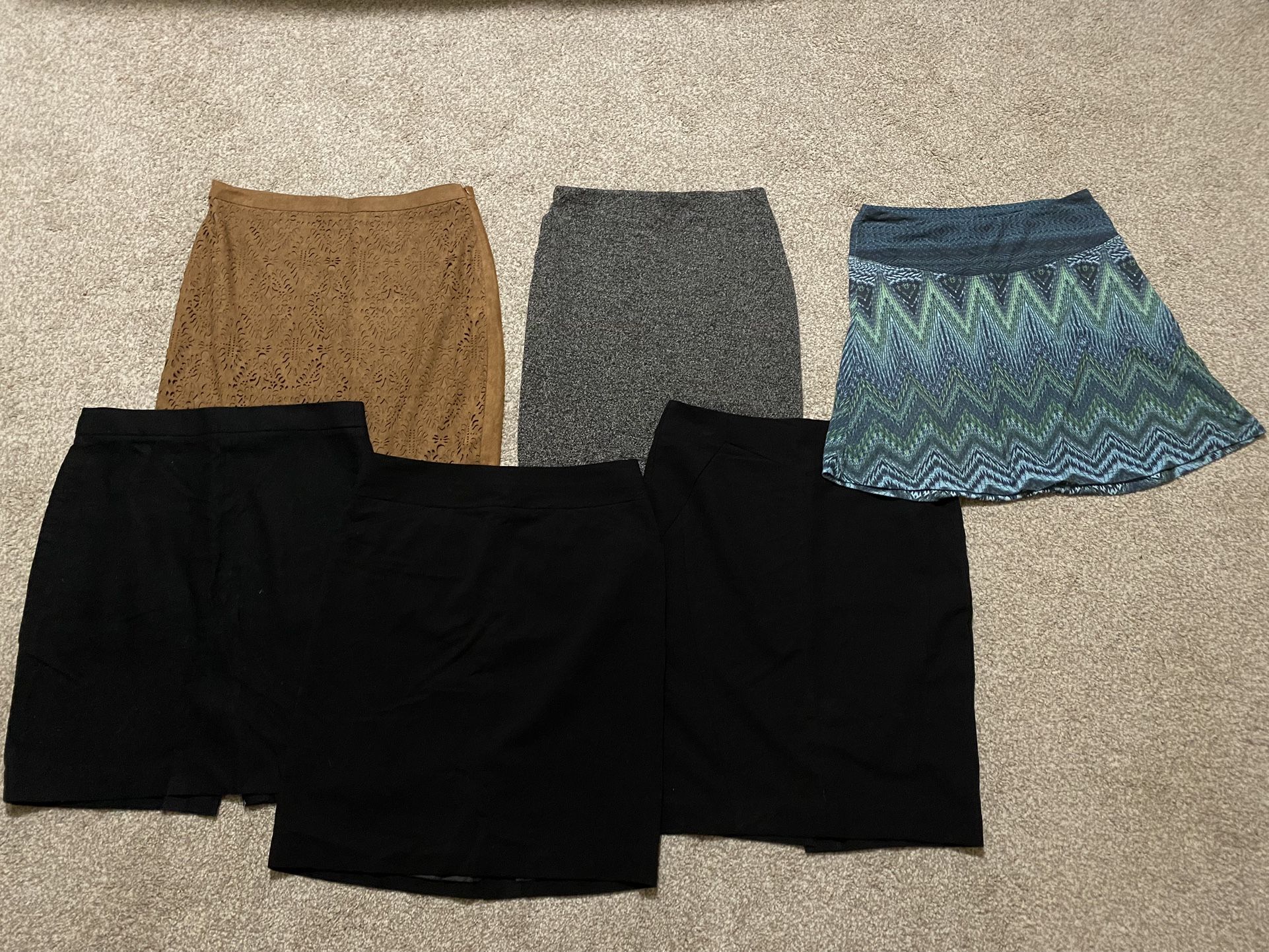 Six skirts. Prana size small (blue). Worthington and j crew size 4 (black). Old navy size extra small (grey). Forever 21 size medium (brown). Would like to give all together.